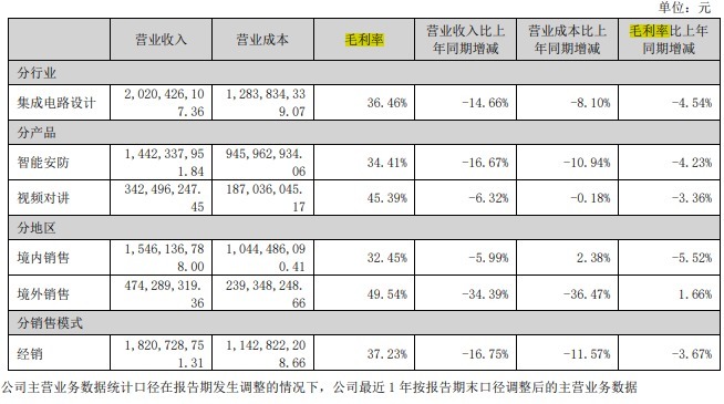 2024年,公司整体毛利率约35.79%,同比下滑0.67%。分行业来看,公司集成电路设计毛利率35.76%,同比下降0.69%。分产品来看,公司智能安防毛利率33.42%,同比下降0.99%;智能物联毛利率44.35%,同比下降1.04%;智能车载毛利率31.01%,同比下降2.99%。