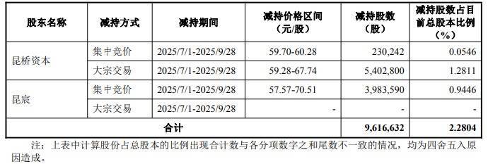星宸科技于2025年9月29日披露的关于公司股东减持计划实施情况暨减持完毕的公告显示,近日,收到公司股东昆桥资本及其一致行动人昆宸出具的《关于股份减持计划实施完毕的告知函》,截止2025年9月28日,在减持计划实施期间,昆桥资本与一致行动人昆宸通过大宗交易和集合竞价方式累计减持公司股份9,616,632股,持有公司股份比例下降至3.8364%,减持情况与此前已披露的减持计划一致,减持数量在减持计划范围内。