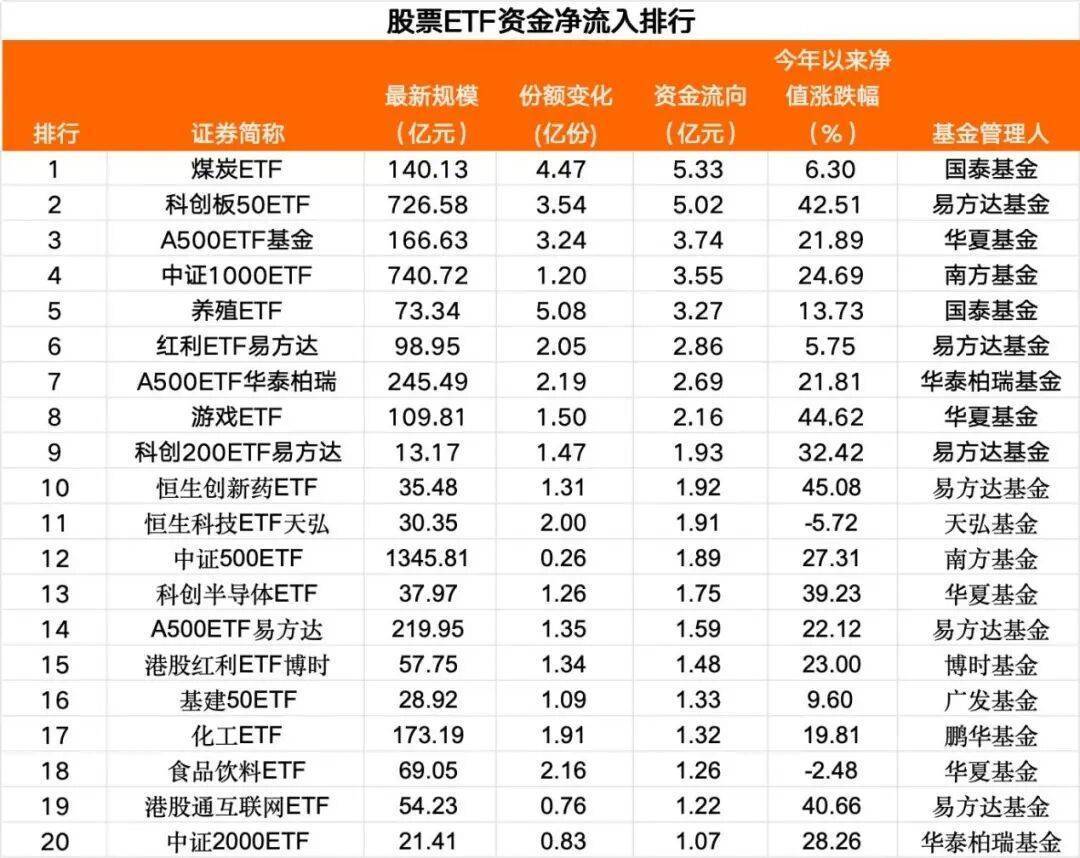从资金净买入排行榜看,当日净流入1亿元以上的股票ETF有21只,部分宽基ETF和行业主题ETF净流入居前。其中,国泰煤炭ETF、易方达科创板50ETF、华夏A500ETF位居前三,资金净流入均超3亿元。